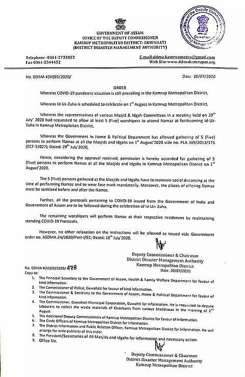ক'ৰ'না মহামাৰীৰ পৰিপ্ৰেক্ষিতত এইবাৰৰ ঈদৰ নামাজত পাঁচজ লোককহে অংশ লোৱাৰ অনুমতি প্ৰদান কৰিছে কামৰূপ(মহানগৰ)জিলা প্ৰশাসনে। এক নিৰ্দেশনাত এই কথা সদৰী কৰি জিলা উপায়ুক্ত তথা জিলা দুৰ্যোগ ব্যৱস্থাপনা কৰ্তৃপক্ষৰ অধ্যক্ষ বিশ্বজিত পেগুৱে কয় যে অহা ১ আগষ্টত পালম কৰিবলগীয়া বকৰি ঈদৰ মছজিদ, দৰগাহ আদিৰ নামাজত কেৱল ৫ জন লোককহে অংশ লবলৈ দিয়া হব। ক'ৰ'না প্ৰতিৰোধৰ বাবে সামাজিক দূৰত্ব মানি চলাটো বাধ্যতামূলক হোৱাৰ পৰিপ্ৰেক্ষিতত প্ৰশাসনে এনে ব্যৱস্থা গ্ৰহণ কৰিছে।