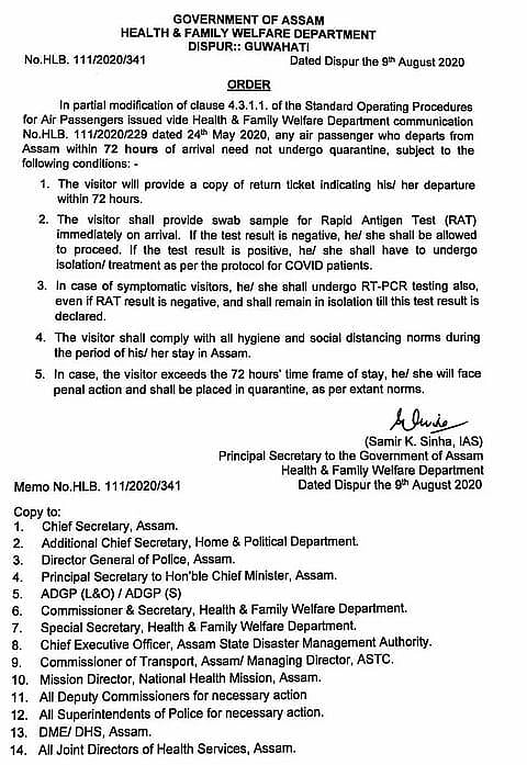 এই নতুন নীতি-নিৰ্দেশনা অনুসৰি অসমলৈ অহাৰ পাছত মাথোঁ ২৪ ঘণ্টাৰ ভিতৰতে অসম ত্যাগ কৰা ব্যক্তিৰ ক্ষেত্ৰত আছুতীয়াকৰণ বা কোৱাৰেণ্টিনৰ প্ৰয়োজন নহ'ব। অৱশ্যে কিছু চৰ্ত থাকিব। এনে চৰ্ত অনুসৰি অসমলৈ অহা এজন ব্যক্তিয়ে তেওঁ যে ২৪ ঘণ্টাৰ ভিতৰতে অসম ত্যাগ কৰিব তাৰ উভতনি টিকট সংশ্লিষ্ট চৰকাৰী কৰ্মীক দেখুৱাব লাগিব। তদুপৰি পৰীক্ষাৰ বাবে তেওঁ স্বাৱ ছেম্পল প্ৰদান কৰিব লাগিব। যদি তেওঁৰ নমুনা পৰীক্ষাত ক'ৱিড-১৯ নিগেটিভ হয়, তেতিয়াহে তেওঁক যাবলৈ দিয়া হব। পজিটিভ হলে কোৱাৰেণ্টিন হব লাগিব।