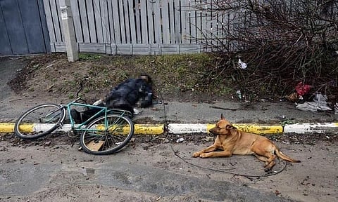 এটা ইউৰোপীয় সংবাদ মাধ্যম সংগঠনে প্ৰকাশ কৰা ছবিখনত উল্লেখ কৰা হৈছে যে ৰাছিয়াৰ বাহিনীয়ে কুকুৰৰ গৰাকীক হত্যা কৰিছিল। তেওঁৰ মালিকৰ মৃত্যু হোৱাৰ পিছত, কুকুৰটোৱে তেওঁৰ মৃত মালিকক এৰিবলৈ অস্বীকাৰ কৰি তেওঁৰ কাষত বহিছিল।