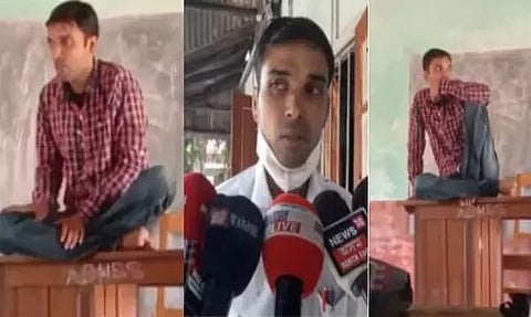 তথ্য অনুসৰি উক্ত বিদ্যালয় খনৰ এগৰাকী শিক্ষকে শ্ৰেণী কোঠাত পাঠদান কৰাৰ সময়ত শিক্ষক সকলৰ বাবে উপলব্ধ কৰোৱা টেবুলৰ ওপৰত এখন ভৰিৰ ওপৰত আন খন উঠাই বহি লয়।