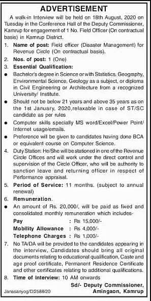 শিক্ষাগত অৰ্হতাঃ চিভিল ইঞ্জিনীয়াৰিঙৰ ডিপ্লমাধাৰী অথবা স্থপতিৰ ডিপ্লমাধাৰী হব লাগিব। নতুবা বিজ্ঞানৰ স্নাতক ডিগ্ৰীধাৰী হব লাগিব। নাইবা পৰিসংখ্যা, ভূগোল, পৰিৱেশ বিজ্ঞান নতুবা ভূ-তত্বক এটা বিষয়ৰূপে লৈ ডিগ্ৰী লোৱা হব লাগিব। তদুপৰি কম্পিউটাৰৰ প্ৰাৰম্ভিক জ্ঞান বিশেষকৈ (MS Word/ Excel/ PowerPoint/ Internet usage/ emails আদিৰ জ্ঞান থাকিব লাগিব।বি চি এ কৰা প্ৰাৰ্থীক অগ্ৰাধিকাৰ দিয়া হব।