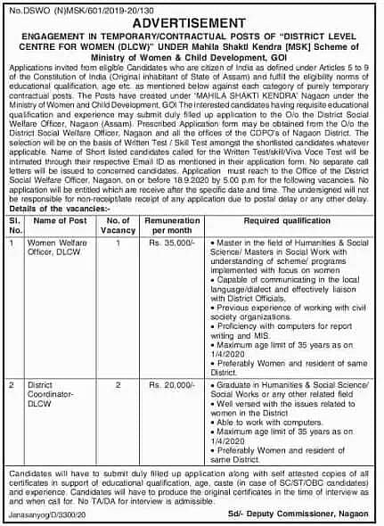 আবেদন গ্ৰহণৰ শেষ তাৰিখঃ ১৮-০৯-২০২০। আবেদনৰ নিয়মঃ অহা ১৯ ছেপ্টেম্বৰৰ সন্ধিয়া ৫ বজাৰ ভিতৰত পোৱাকৈ আবেদন পত্ৰ নগাঁৱৰ জিলা সমাজ কল্যাণ বিষয়া কাৰ্যালয়লৈ প্ৰেৰণ কৰিব লাগিব।