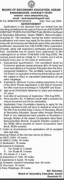 বেতনঃ মাহিলী ১৭হেজাৰ টকা (বাৰ্ষিক বৃদ্ধি আৰু ডি একে ধৰি)। আবেদনৰ মাচুলঃ ২০০টকা। এই মাচুল Secretary, Board of Secondary Education, Assam-ৰ হকে গুৱাহাটীত ভঙাব পৰাকৈ ডিমাণ্ড ড্ৰাফটযোগে প্ৰেৰণ কৰিব লাগিব। অথবা এপেক্স বেংকৰ ট্ৰেজাৰী চালানযোগে ছেবাৰ কাৰ্যালয়ত পোৱাকৈ পঠিয়াব লাগিব। আবেদনৰ নিয়মঃ প্ৰাৰ্থীয়ে মেট্ৰিকৰ পৰা আৰম্ভ কৰি সকলো শিক্ষাগত অৰ্হতা, বয়স, অভিজ্ঞতা আদিৰ প্ৰমাণপত্ৰৰ প্ৰত্যায়িত কপি অহা ১৫ আগষ্টৰ ভিতৰত পোৱাকৈ প্ৰেৰণ কৰিব লাগিব।