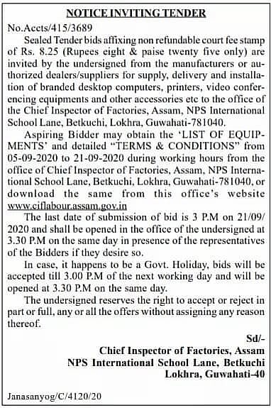 গুৱাহাটীৰ লখৰাৰ বেতকুচিস্থিত কাৰখানাসমূহৰ মুখ্য পৰিদৰ্শকৰ কাৰ্যালয়ত ব্ৰেণ্ডেড ডেস্কটপ কম্পিউটাৰ, প্ৰিণ্টাৰ, ভিডিঅ কনফাৰেন্সৰ সঁজুলি আদি যোগান আৰু স্থাপনৰ বাবে বন্ধ নিবিদা আহ্বান কৰা হৈছে। নিবিদাত ৮.২৫ টকাৰ আদালতৰ মাচুলৰ মোহৰ লগাব লাগিব।
