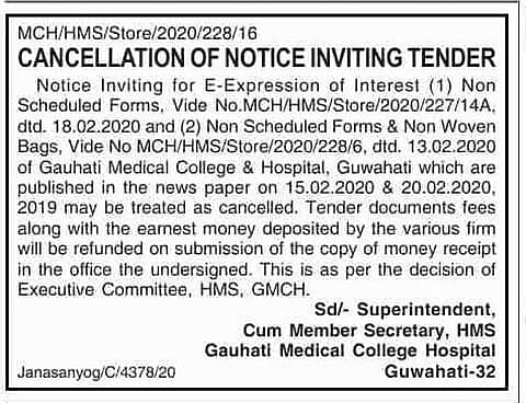 গুৱাহাটী চিকিৎসা মহাবিদ্যালয়ত (১) অ-সূচীভুক্ত প-পত্ৰ যোগানৰ বাবে MCH/HMS/Store/2020/227/14A , তাৰিখ ১৮-০২-২০২০ নম্বৰৰ জাননীযোগে আৰু