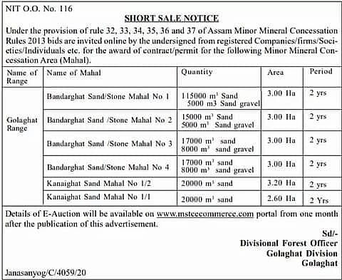 অসম ক্ষুদ্ৰ খনিজ ৰেহাই বিধি,২০১৩ৰ ৩২, ৩৩, ৩৪, ৩৫, ৩৬ আৰু ৩৭বিধিৰ অধীনত নিম্নোক্ত স্বাক্ষৰকাৰীয়ে পঞ্জীয়নভুক্ত ফাৰ্ম/কোম্পানী/ছ'চাইটী/ব্যক্তিৰ পৰা নিম্নোক্ত মহলসমূহ ঠিকা/অনুমতি প্ৰদানৰ বাবে নিবিদা বিচাৰিছে ৷