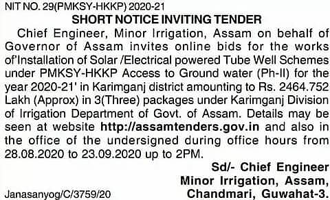 কৰিমগঞ্জত সৌৰ/বিদ্যুত শক্তিচালিত টিউবৱেল স্থাপনৰ বাবে গুৱাহাটীৰ চান্দমাৰীস্থিত ক্ষুদ্ৰ জলসিঞ্চনৰ মুখ্য অভিযন্তাই নিবিদা আহ্বান কৰিছে । এই টিউবৱেল ২০২০-২১ত এই কাম কৰিব লাগিব। ইয়াৰ নিবিদা মূল্য ২৪৬৪.৭৫২ লাখ টকা। নিম্নোক্ত স্বাক্ষৰকাৰীৰ কাৰ্যালয়ত অহা ২৩ ছেপ্টেম্বৰৰ দিনৰ ২ বজালৈকে নিবিদাৰ সবিশেষ পাব। তদুপৰি http://assamtenders.gov.inতো ইয়াৰ সবিশেষ পাব।