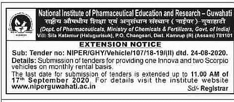 নিবিদা নম্বৰঃ NIPER/GHY/Vehicle/107/18-19/(ll), তাৰিখঃ ২৪-০৮-২০২০।