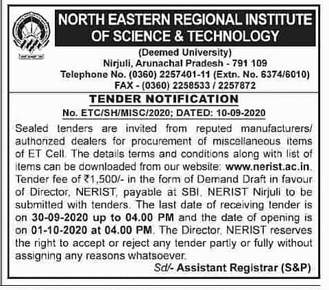 নিবিদা গ্ৰহণৰ শেষ তাৰিখ: ৩০-০৯-২০২০ৰ বিয়লি চাৰি বজা ৷ নিবিদা ০১-১০-২০২০-ৰ বিয়লি চাৰি বজাত মুকলি কৰা হ'ব ৷এই নেৰিষ্টৰ সঞ্চালকৰ কোনো প্ৰদৰ্শন নকৰাকৈ কোনো নিবিদা গ্ৰহণ আৰু কোনো নিবিদাৰ আংশিক বা সম্পূৰ্ণৰূপে নাকচৰ অধিকাৰ আছে ৷