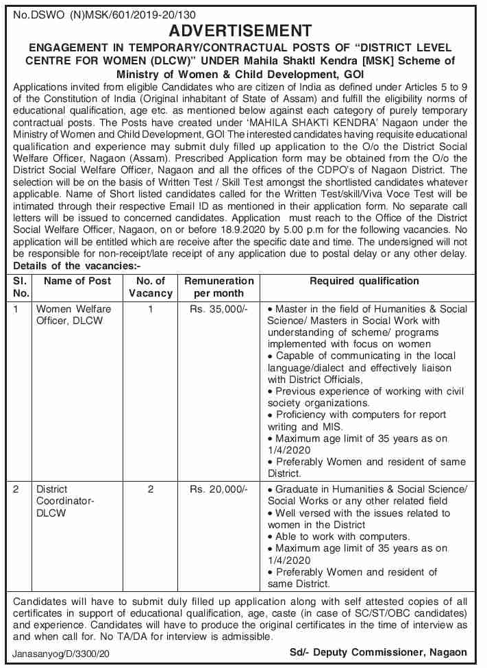 আবেদনৰ নিয়মঃ অহা ১৯ ছেপ্টেম্বৰৰ সন্ধিয়া ৫ বজাৰ ভিতৰত পোৱাকৈ আবেদন পত্ৰ নগাঁৱৰ জিলা সমাজ কল্যাণ বিষয়া কাৰ্যালয়লৈ প্ৰেৰণ কৰিব লাগিব।
