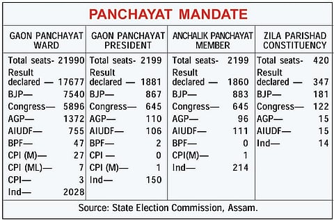 আমি এতিয়ালৈকে পঞ্চায়ত নিৰ্বাচনৰ ৪২০ খন জিলা পৰিষদৰ আসনৰ ভিতৰত ৩৪৭ খন আসনৰ ফলাফল ঘোষণা কৰিবলৈ সক্ষম হৈছো ৷ তাৰে ভিতৰত, এজিপিৰ ১৫ খন,বিজেপিৰ ১৮১ খন,কংগ্ৰেছৰ ১২২ খন আসন,এআইইউডিএফে ১৫ খন আসনৰ বিপৰীতে অন্যান্যই ১৪ খন আসন দখল কৰিবলৈ সক্ষম হৈছে। নিৰ্বাচনী আয়ুক্ত হৰেন্দ্ৰ নাথ বৰাই লগতে কয় যে, আমি এতিয়ালৈকে ২৮ খন জিলা আৰু ৰাজহ চক্ৰত পঞ্চায়ত নিৰ্বাচনৰ ফলাফল লাভ কৰিবলৈ সক্ষম হৈছো৷ কিছুসংখ্যক জিলাত সম্প্ৰতি ভোটগনণা সম্পন্ন হৈছে যদিও কিন্তু তাৰ ফলাফল এতিয়াও পোৱা নাই ৷ অন্যহাতে, কাছাৰ আৰু ধুবুৰী জিলাত এতিয়াও ভোটগ্ৰহণ চলি আছে ৷ লগতে হাইলাকান্দি আৰু গহপুৰ জিলাদুখনত পুনৰ ভোটগ্ৰহণত অনুষ্ঠিত হয়।