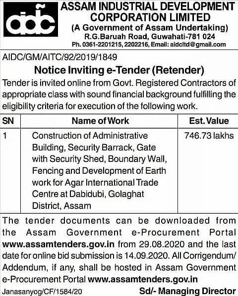 নিবিদা নথি অসম চৰকাৰৰ ই-প্ৰকিউৰমেণ্ট পৰ্টেল www.assamtenders.gov.inত পাব। অনলাইন নিবিদা নথি গ্ৰহণৰ শেষ তাৰিখ ১৪-০৯-২০২০।
