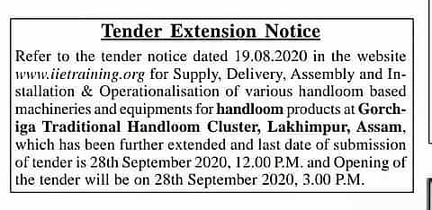 লখিমপুৰৰ গড়চিগা পৰম্পৰাগত হস্ত-শিল্প মণ্ডলত বিভিন্ন ধৰণৰ হস্তশিল্প নিৰ্ভৰ সঁজুলি আৰু যন্ত্ৰাদি যোগান, আদায়, স্থাপন,চালনৰ বাবে ১৯-০৮-২০২০ত www.iietraining.org ত উপলব্ধ নিবিদা জাননীৰ নিবিদা গ্ৰহণৰ অন্তিম তাৰিখ ২৮-০৮-২০২০ৰ দুপৰীয়া ১২বজালৈ বৃদ্ধি কৰা হৈছে ৷
